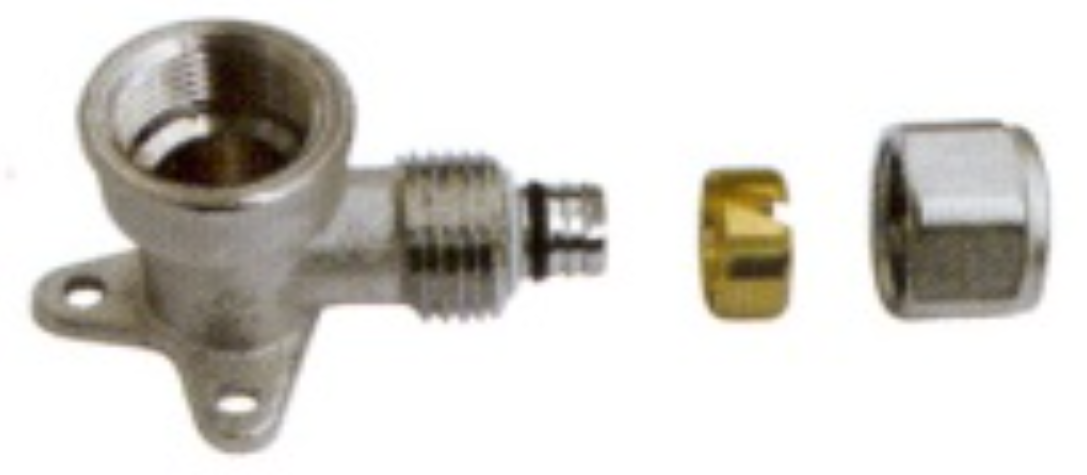 Acessório de aperto mecânico (compressão) com patilha de fixação, que cria uma saída de parede a 90º com rosca fêmea. É a peça essencial para criar um ponto de ligação seguro e estável para torneiras, diretamente a partir de um tubo multicamada, sem necessidade de ferramentas de cravagem.