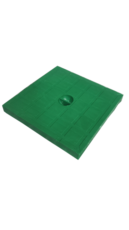 Tampa de saneamento com aro fabricada em polipropileno (PP) de cor verde, utilizada para cobrir e proteger caixas de visita ou caixas de inspeção em redes de esgotos ou águas pluviais.